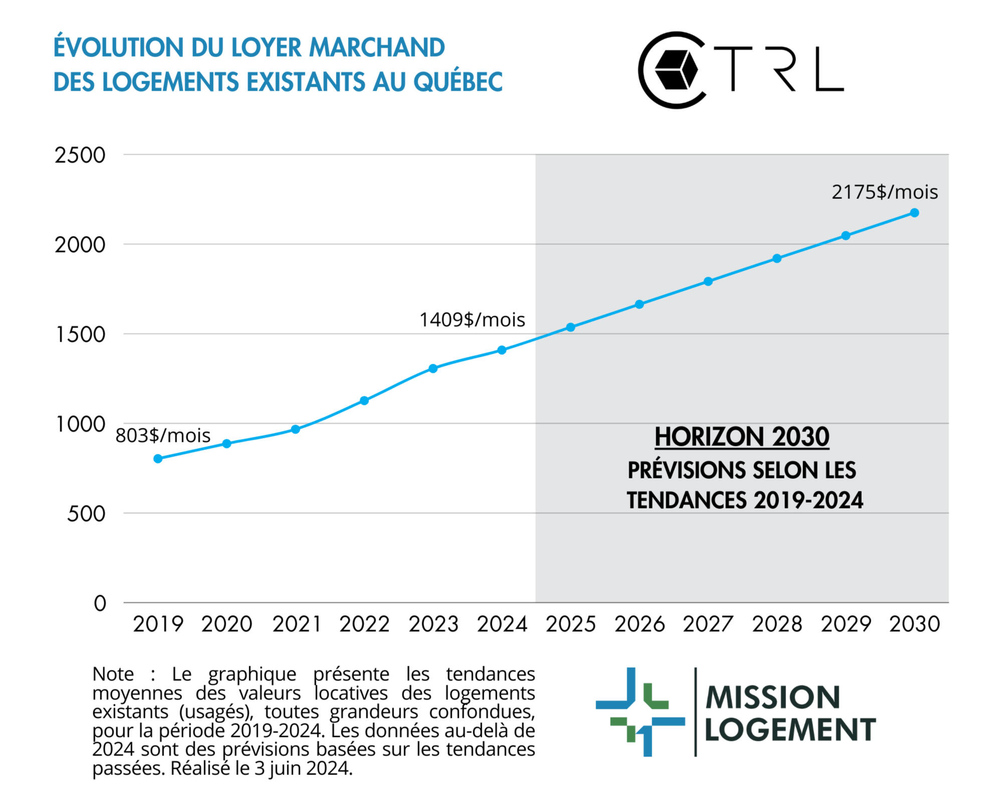 Nos observations indiquent que le loyer moyen au Québec a progressé de 75 % depuis 2019. D’ici 2030, si cette hausse historique se maintient, le loyer moyen pourrait dépasser largement les 2 000 $ par mois, rendant le logement inaccessible pour une grande partie de la population. Oui, il est indéniable que l’heure est à l’action !