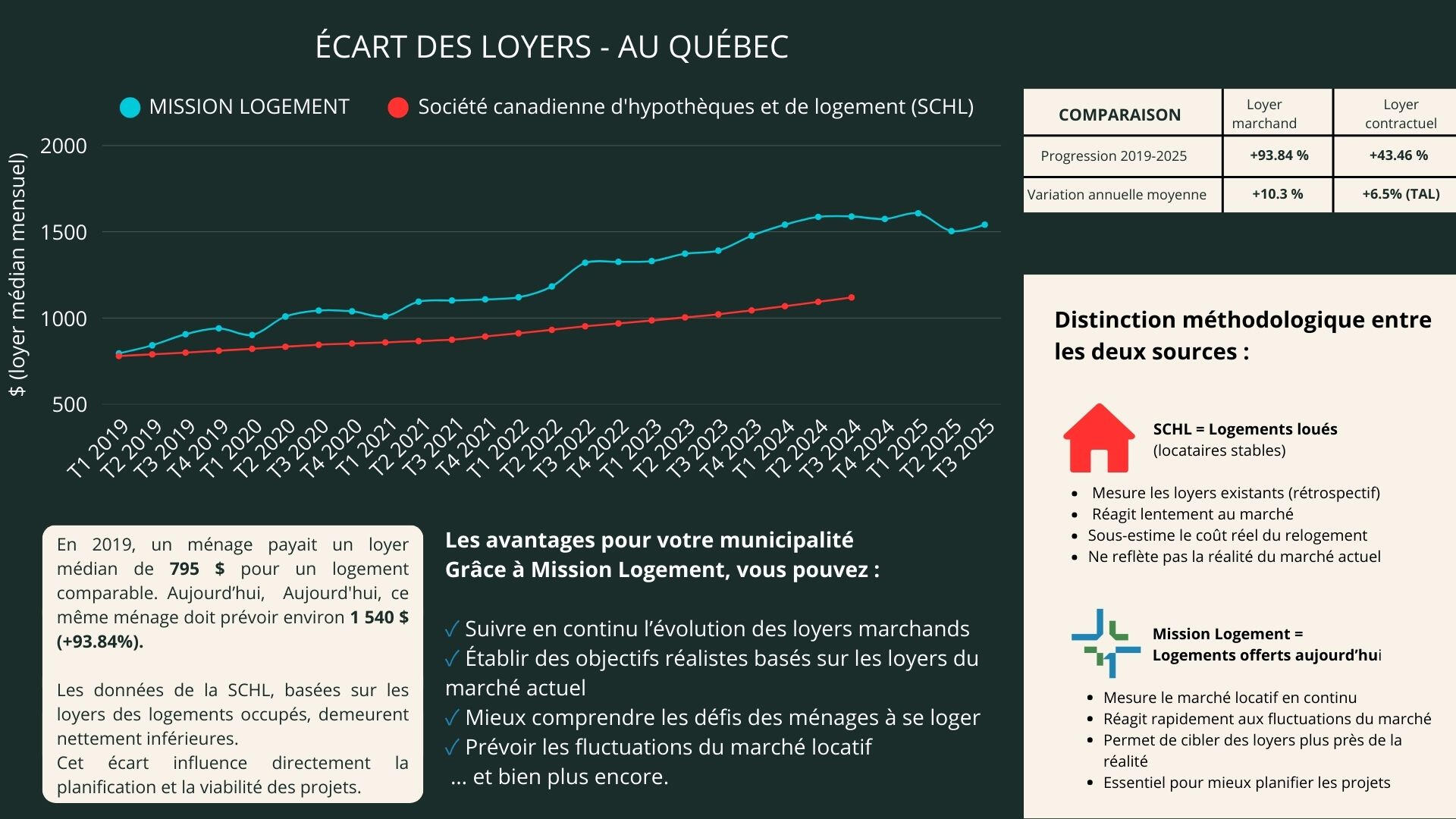 Pour renforcer l’action locale en matière d'habitation, nous outillons les villes, les MRC et les acteurs du logement avec des données objectives et plus précises, afin d’améliorer la planification, l’offre et l’abordabilité des logements au Québec.Ce qui nous distingue : le loyer marchand et notre lecture des enjeux du logementLa situation actuelle exige de poser un regard direct sur la réalité de chaque territoire, plutôt que de s’en remettre à des moyennes globales qui masquent les particularités de chaque territoire.Avec Mission Logement, agissez sur les enjeux actuels du logement et anticipez ceux de demain.
