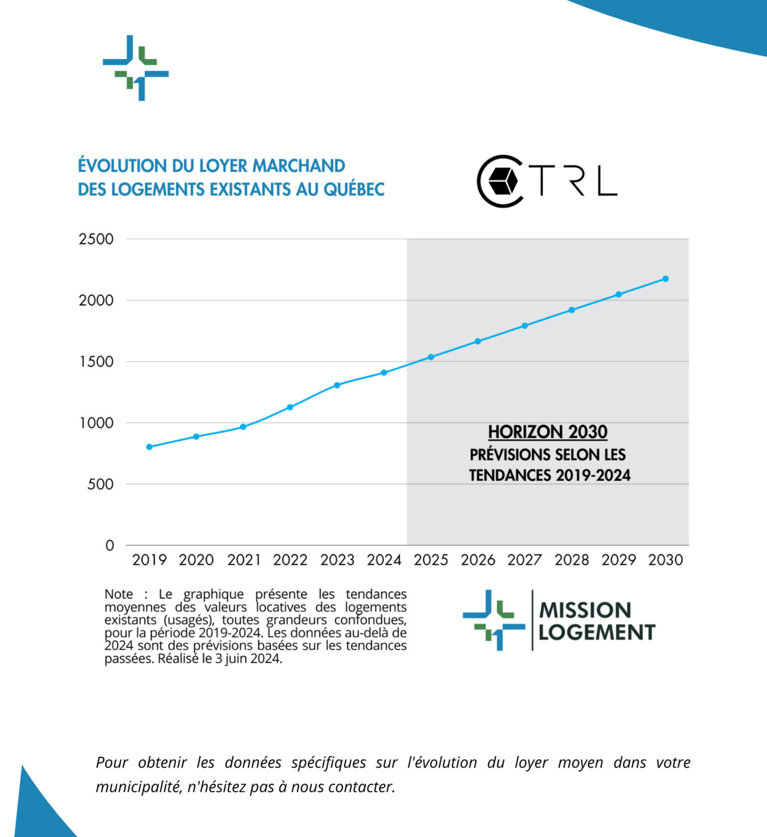 Nos observations indiquent que le loyer moyen au Québec a progressé de 75 % depuis 2019. D’ici 2030, si cette hausse historique se maintient, le loyer moyen pourrait dépasser largement les 2 000 $ par mois, rendant le logement inaccessible pour une grande partie de la population. Oui, il est indéniable que l’heure est à l’action !