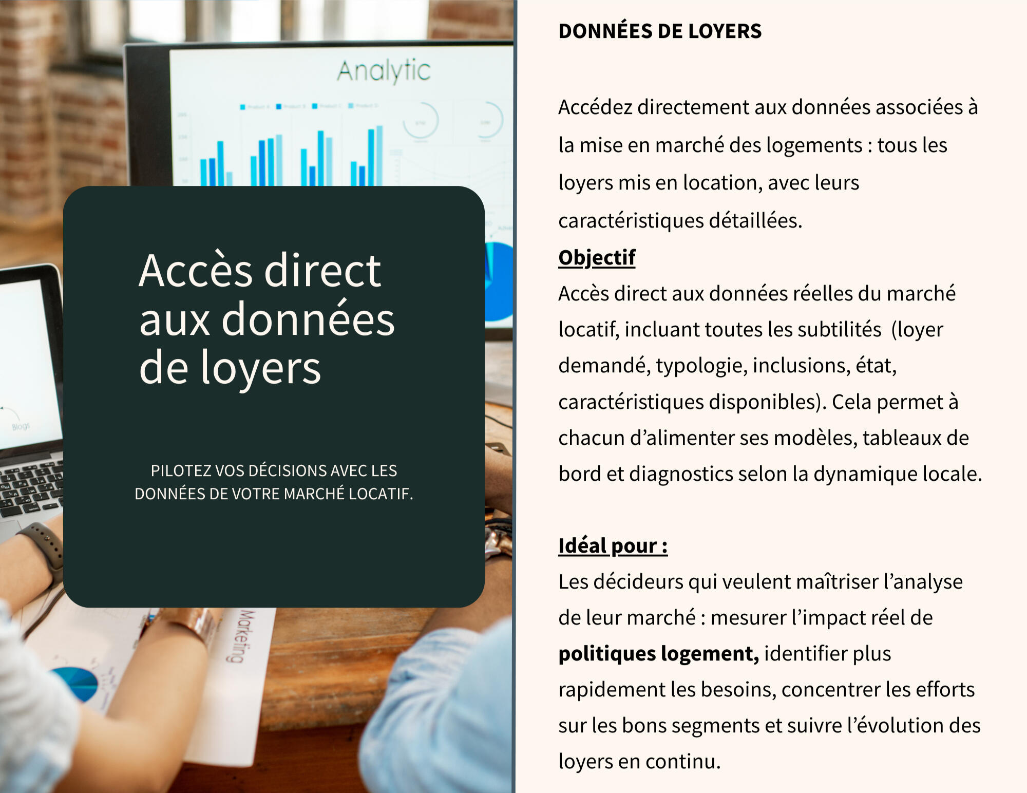 Un encadrement axé sur la donnée est prévu afin de suivre les tendances du logement et l’évolution des loyers marchands.- Optimisation des ressources : Nos rapports fournissent des informations détaillées permettant de prendre des décisions efficaces afin d'allouer les efforts et ressources aux bons endroits.